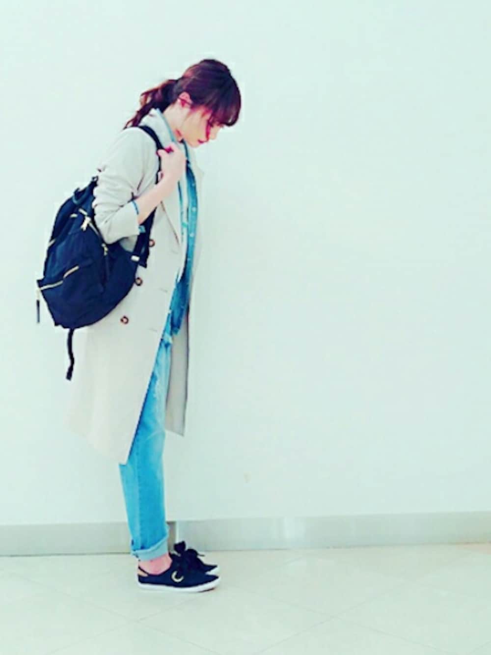 デニムオンデニムにトレンチコートで コーディネートしました(*´∇`*) 春のアウターといえばトレンチコート ですね♪ トレンチコートは綺麗目なイメージが ありますが、スニーカーとリュックで 少しカジュアルな感じにしました! トレンチコートから少し見えている さりげないデニムオンデニムコーディネートなので とても着やすいです(^O^)♪