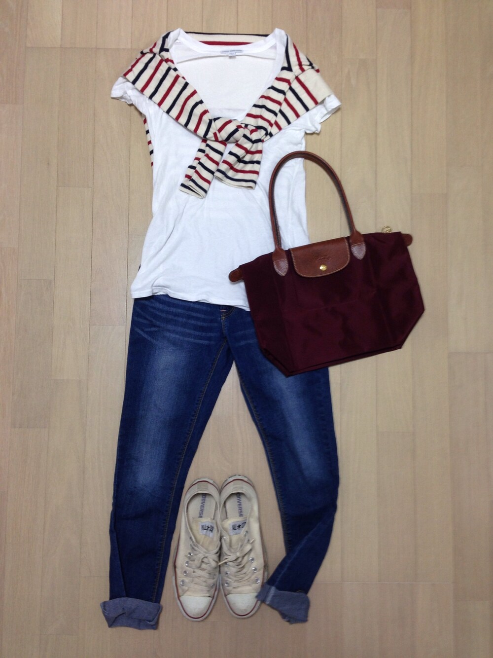 ボーダートップス:無印良品 Tシャツ:JAMES PERSE デニム:楽天 バッグ:LONGCHAMP 秋色のバッグ♬ 早く涼しくなれー! ロンシャンのトート、大きいサイズ欲しいな〜