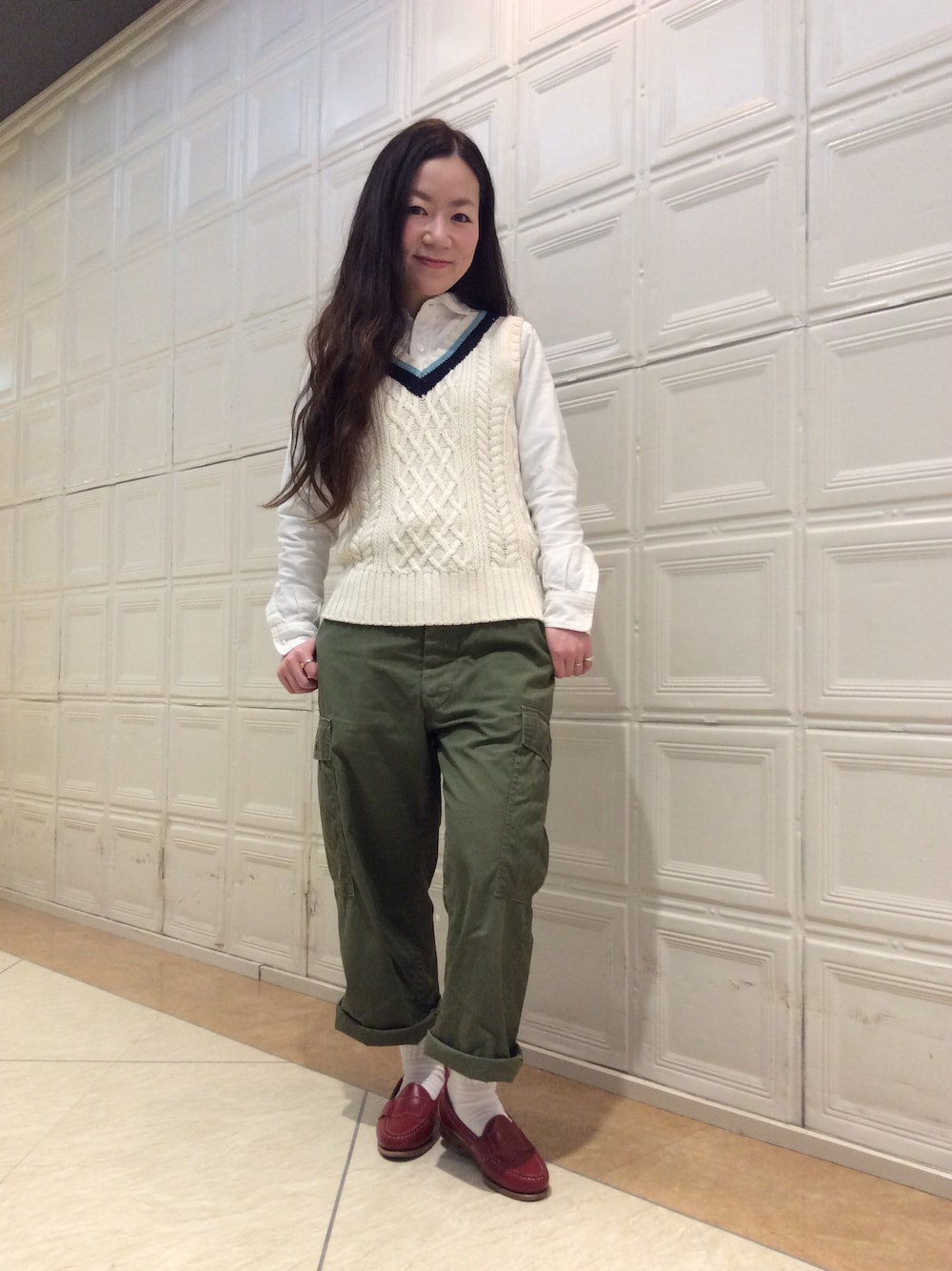 シャツとチルデンベスト、ローファーで 学生さんのような雰囲気に、 ミリタリーパンツではずしました! ベストのカラーリングが大好物♪