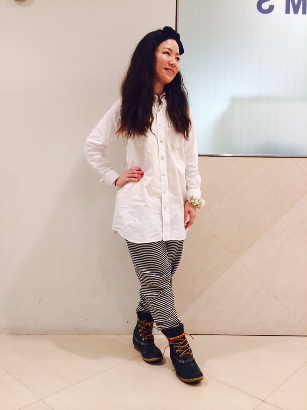 ラフなボーダーパンツは 白シャツワンピでしゃきっと! 今日は朝から雨降り… そんな日もL.L.Beanのブーツで テンションUPです♪ ヘアバンドで女の子らしさを プラス(^^)