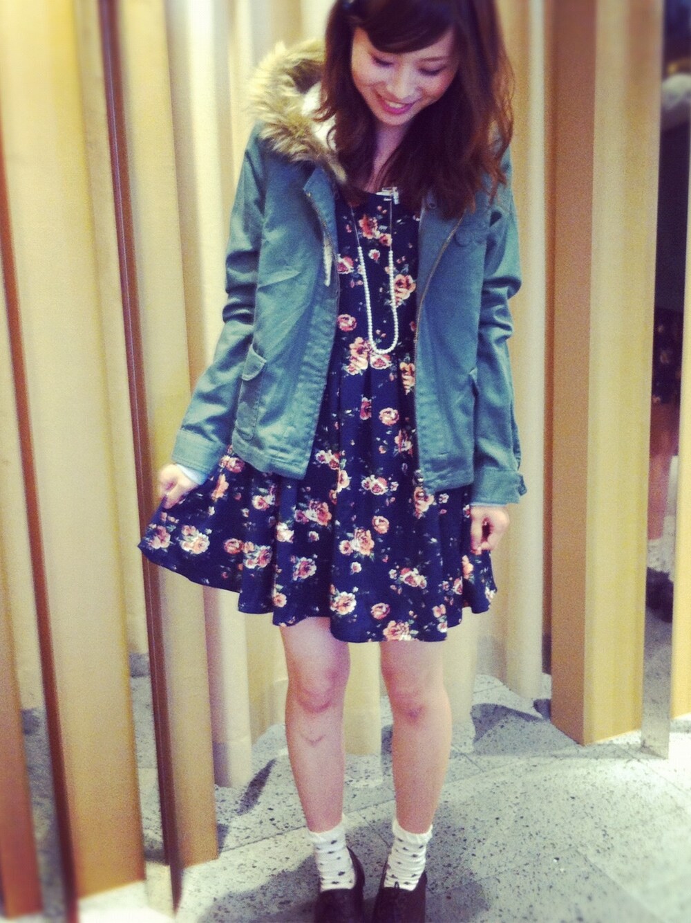 花柄ワンピをブルゾンでカジュアルダウン
