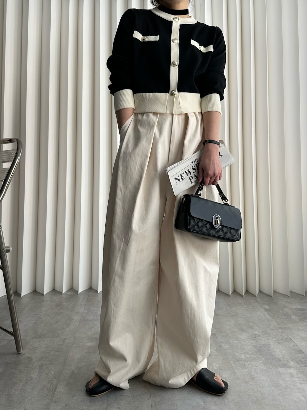 ちょっぴり、柄でもないキレイめ🙈 若干スポンディッシュな弾力ある素材です。 こんな日もなかなかいいじゃないか🤭🖤 春物新作のコンパクトカーディガンは私着用の配色もあります!