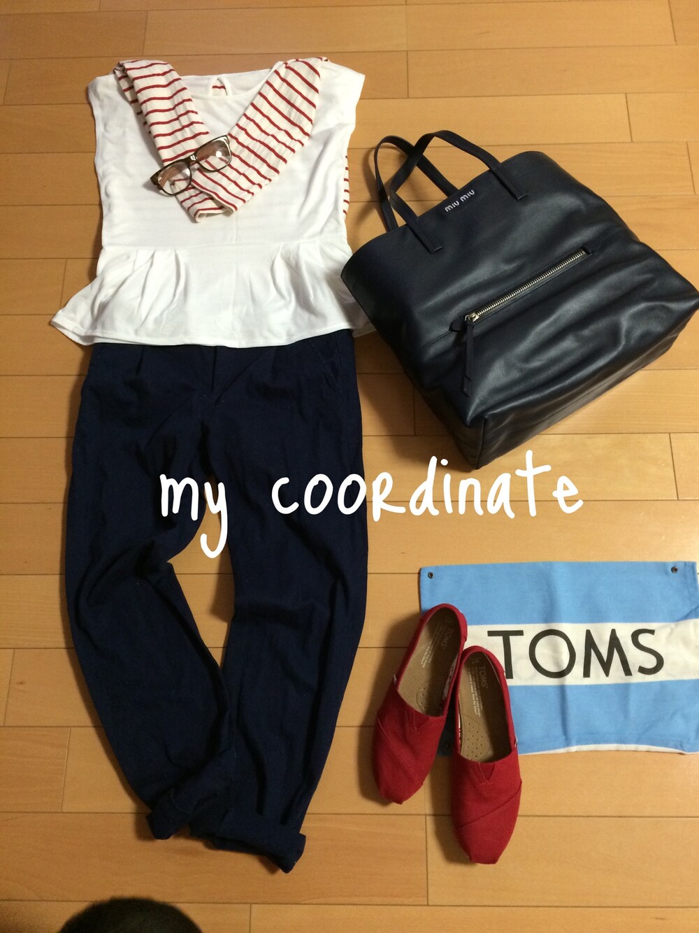 赤を差し色にまとめたコーデ。 レッド×ホワイト×ネイビーのマリンスタイルって暑くなってきたらやりたくなる〜 みなさんのオシャレなコーデ見て日々勉強してます‼︎( ´ ▽ ` )ノ お洋服って奥が深いな〜 Tシャツ:G.U バッグ:miumiu 靴:TOMS