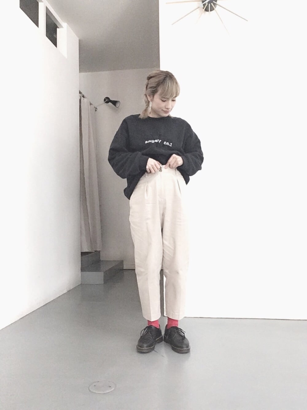 こんばんは☺️ 今日はシンプルコーデにしました☺️ 赤靴下がポイントです♡ いつもいいねSAVEなどありがとうございます♪😉