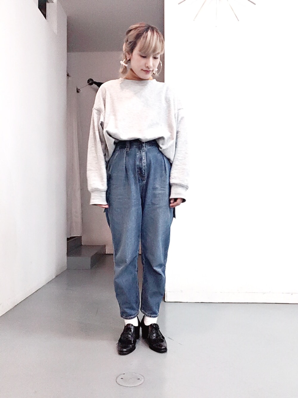 こんばんは☺️ XLサイズのスウェットにデニム😉 足元はきちんと感のある靴にしました♪ 今日は雨で寒かったのでハイネックを中にきました☺️ やっぱりハイネックはあったかーい☺️今日もありがとうございました😊💕