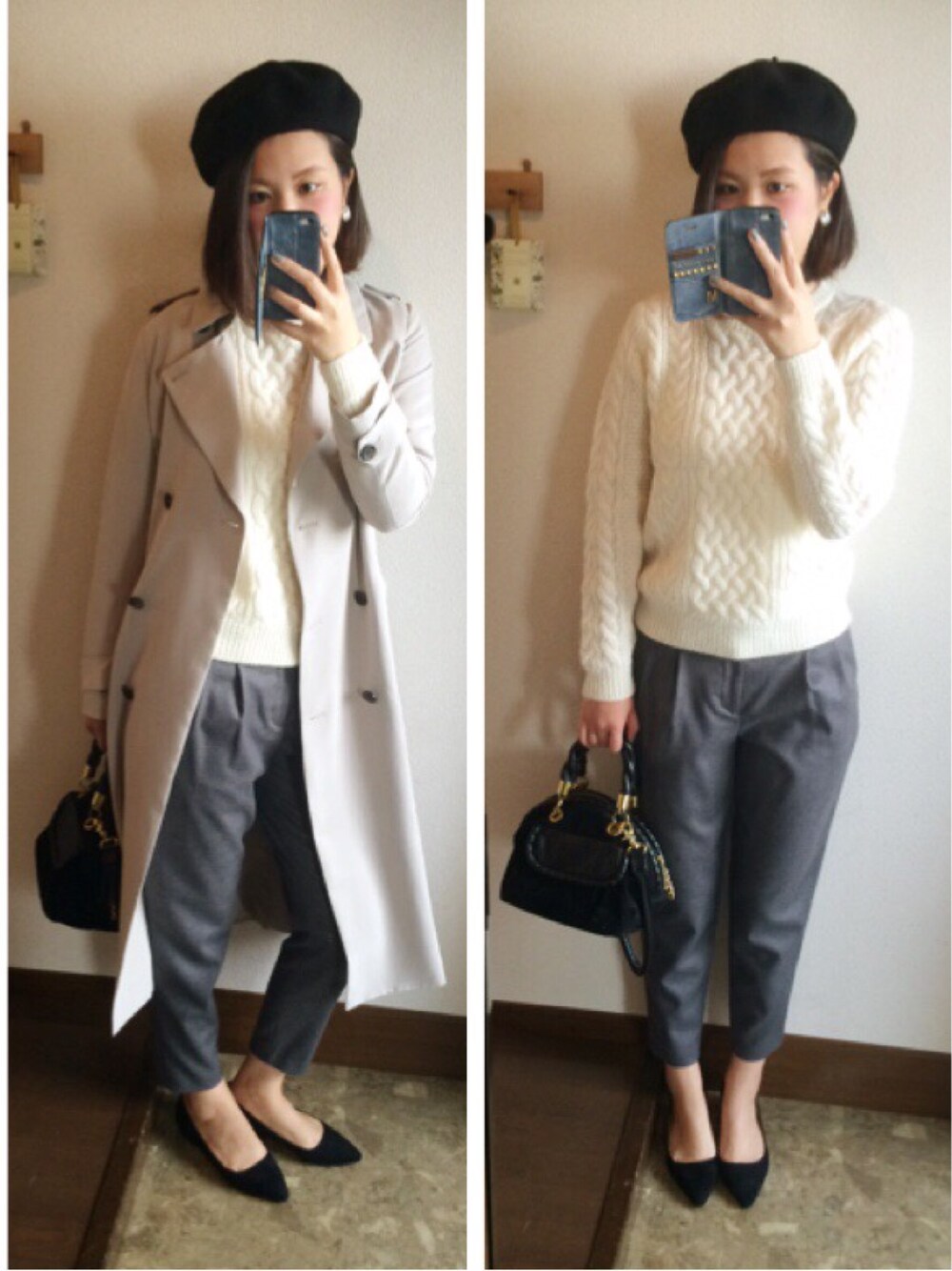 バッグ以外オールニューアイテム★! UNIQLOのウール100のニットあったかいし ケーブル編みで可愛いし買って正解! 夜は寒いからマキシ丈のトレンチを。 ライトグレーで大人っぽく着れてお気に入り♡ パンツのチャコールグレーと合わせてみました。 安定のモノトーンコーデ\(^o^)/ インスタグラム▶︎ma.mi.nnie