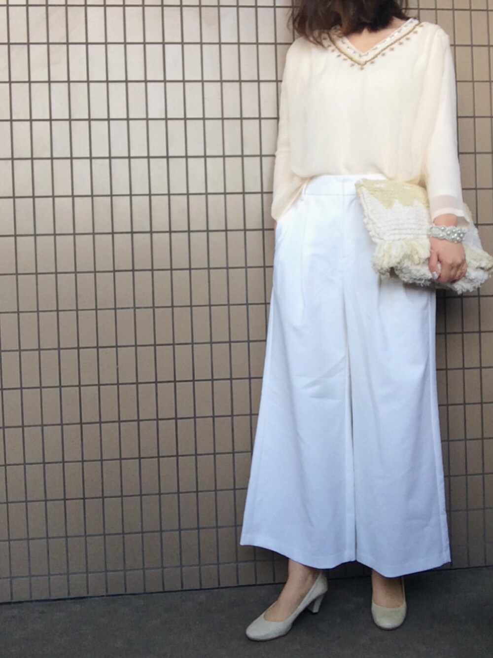 ラグシーのエスニック春ブラウスを使って コーディネートを組んでみました。 合わせてピアスもエスニック風に。 ひさびさのワントーンコーデで春らしく。 でも現実は真冬並みの寒さ。。。