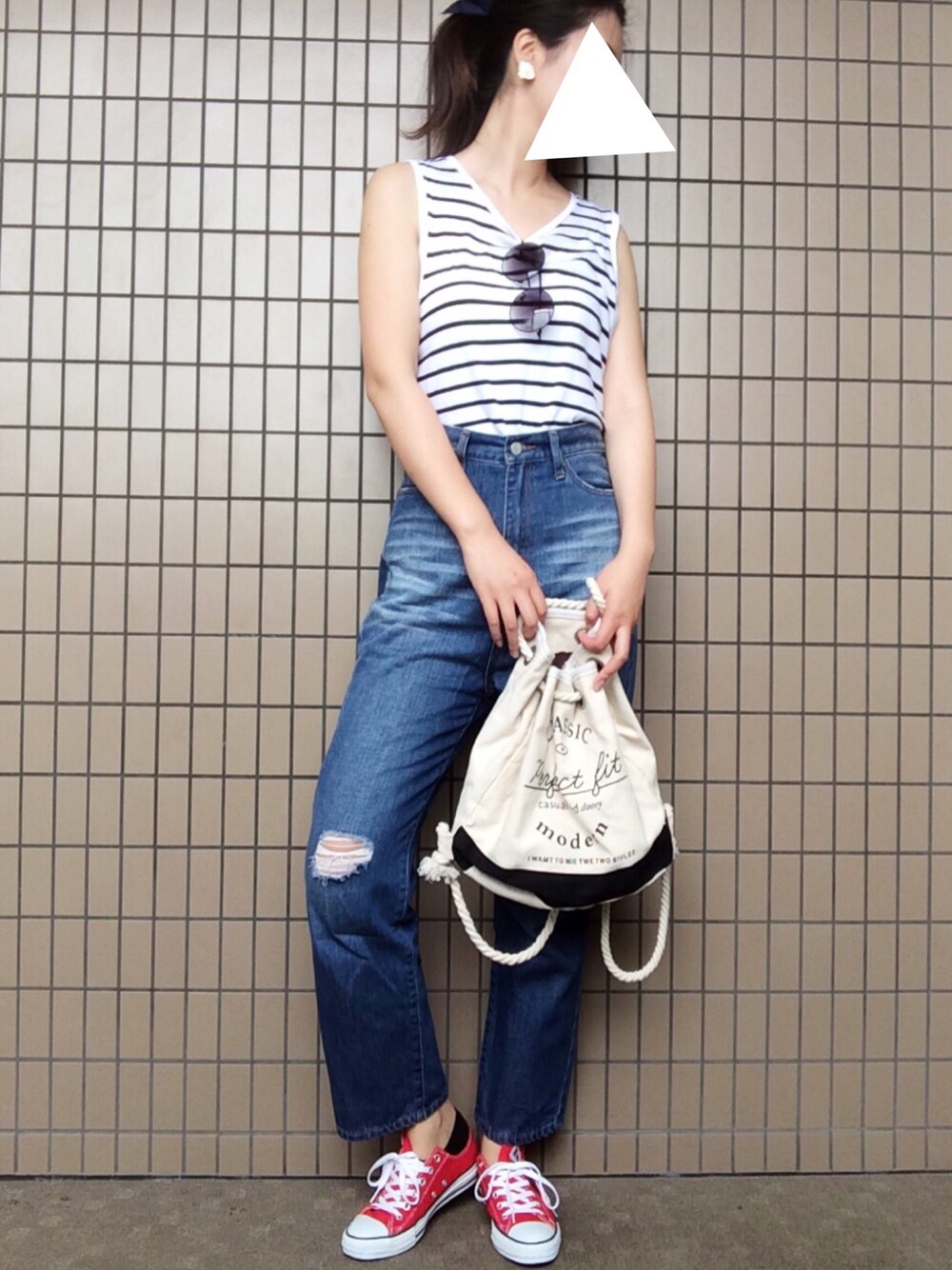 今日も暑い! タンクにハイウエストデニム👖 オールバックポニーに バンダナで作ったデカリボンをドーンと。 インスタグラム▶︎ma.mi.nnie