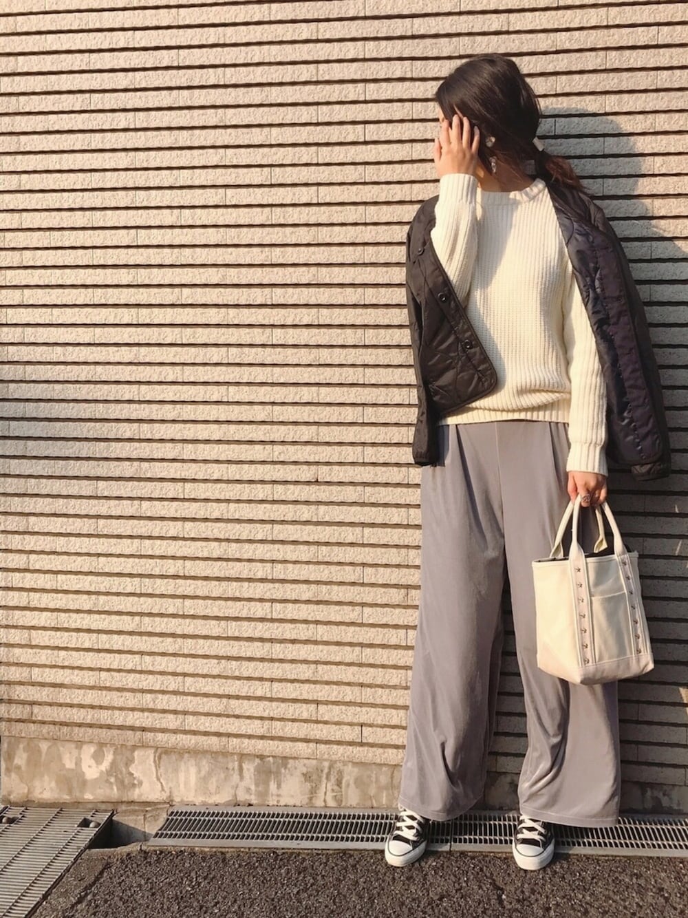 \ はろー!2月 / 強風でアウター捲れて パンツ脚にへばり付いてるー アウターはUNIQLOの ウォームパデットミリタリージャケット 旦那と兼用です ちなみにニットも旦那と兼用 インスタグラム プライベート▶︎ma.mi.nnie ハンドメイドアクセサリー▶︎maminnie_store