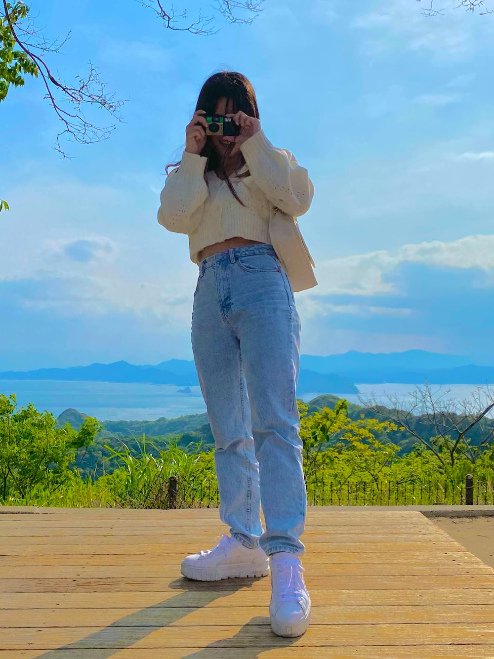 白のニットカーディガンに薄めのブルーのデニムを合わせたコーデです👖🤍 ☻トップス:SHEIN サイズL SHEIN EZwear 花刺繡 ポワンテルニット クロップカーディガン 商品番号:3038856 ☻バッグ:SHEIN ハートパターン ショルダーバッグ【完売商品】 商品番号:3016644