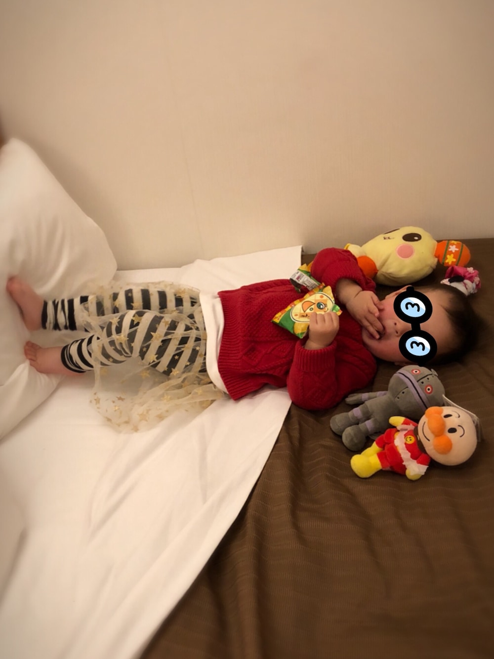 明日から初飛行で博多ばい✈️✈️ お友達の家にお邪魔します❤️ パパ抜きだからパパには申し訳ないけど、美味しいものたくさん食べてきます👌 朝早いからラッシュのことも考え、空港近くに前泊しました。 我が家以上にくつろぐ娘。 自由な人です。 近くの銭湯に行き、ポカポカの中ぐっすり夢の中です♨️ 初飛行機、心配でたまらんです。 飲み物、お菓子、パン、絵本、ぬいぐるみ、、、グッズは揃えました。 どうか何事もなく大人しく乗ってくれますように。