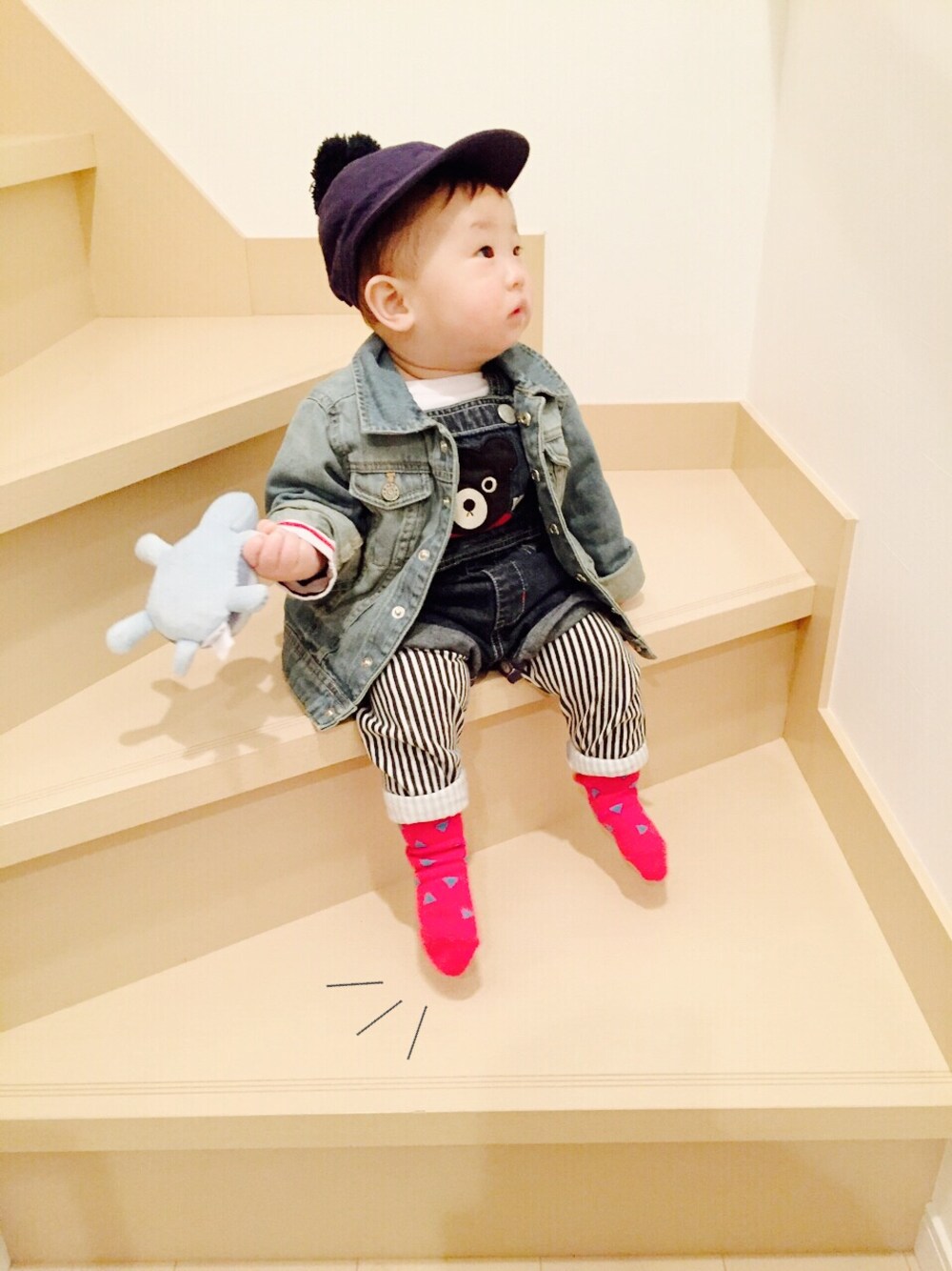 皆様息子のことを心配して頂きありがとうございました( ᵒ̴̶̷̥́ㅿᵒ̴̶̷̣̥̀ )お陰様で熱も今朝下がり、後は咳と鼻水がまだすっきりしないので完治までもう少し(^^)昨日は10時間ぐらい息子はぶっ通しで寝続けてたので、私もゆっくりすることができました♡今日もゆっくりしよー♪笑 自分では挑戦できないデニムオンデニムにしてみました\(◡̈)/♥︎いつものアイテムばかりです^_^;WEARでオシャレkidsが赤靴下履いてたので真似してみました☆明らかオーバーサイズ‼︎(°_°) 今日のおもちゃはカメです(^^)