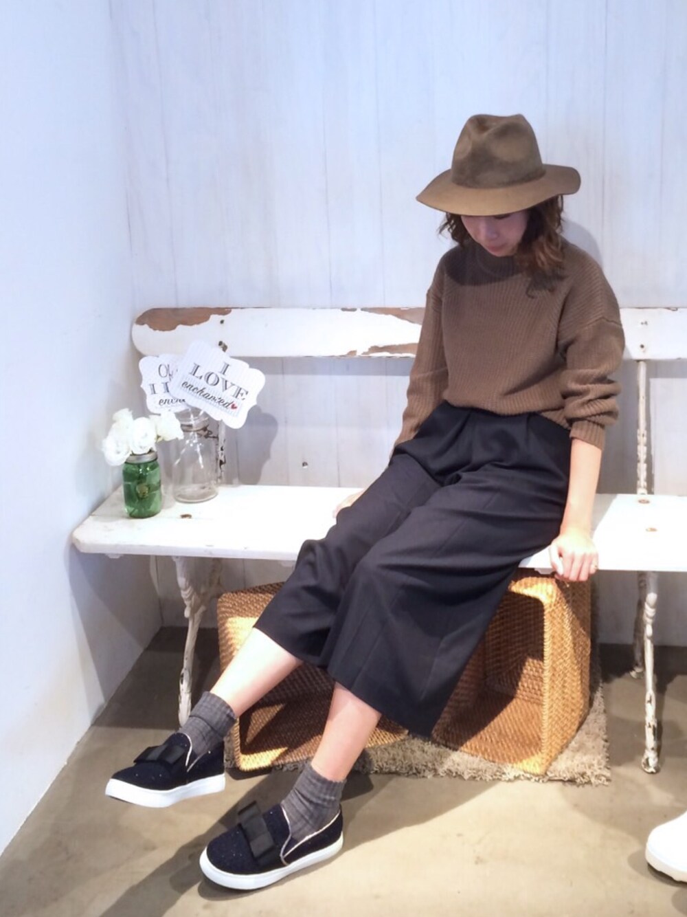 明日から展示会なので今日は準備🌵✨ お花もいっぱい飾って春らしさ満点に!! ニットの季節がやってきたので ブラウンのニットを🎩 これ、GUで¥1900! GUかわいいんだね♡ 足元は エンチャンテッドプリマの リボンスリッポン! だいぶ秋めいてきて嬉しい♡♡