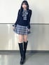 ネイビー×チェックでまとめたクラシカルガーリーコーデ💙 リボン付きブラウスとニットのレイヤードで、上品さと可愛さを両立しました。 プリーツスカートで程よく動きを出し、ロングブーツで秋らしいバランスに✨ デートやお出かけにもぴったりな、王道フェミニンスタイルです🫶🏻
