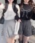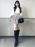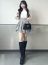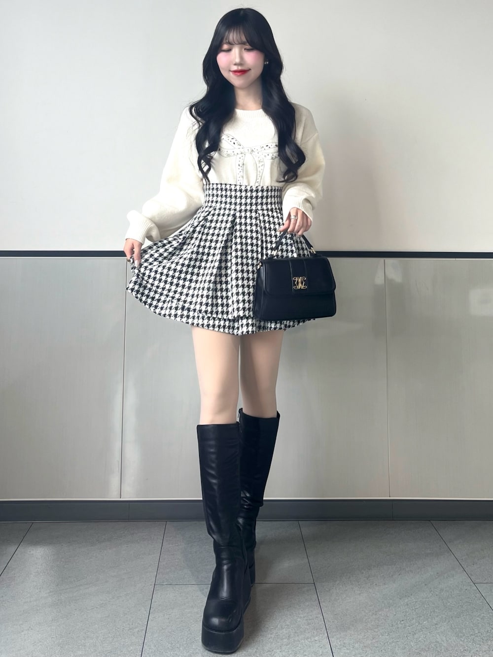 千鳥柄ミニスカートにロングブーツを合わせて 脚長&美脚効果◎ トップスはリボンデザインで さりげなく甘さをプラスしました🤍 Instagram@_mana1ng