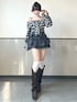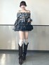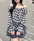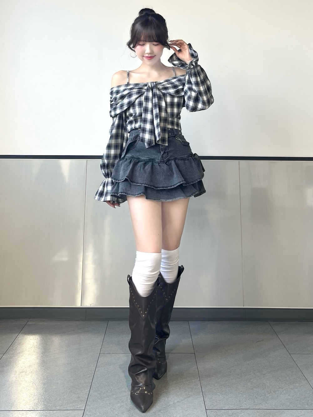 チェック柄のリボンオフショルブラウスを主役にした、 モノトーンガーリーカジュアルコーデ🖤 程よく肌見せできるオフショルデザインで抜け感をプラスしつつ、 リボンディテールで甘さもしっかりキープ🎀 ボトムはグレーのデニムフリルスカートを合わせて、 カジュアルさとガーリーさをバランス良くミックス✨ モノトーンでまとめることで可愛くなりすぎず、 大人っぽく着こなせるのもポイントです🫶 Instagram@_mana1ng