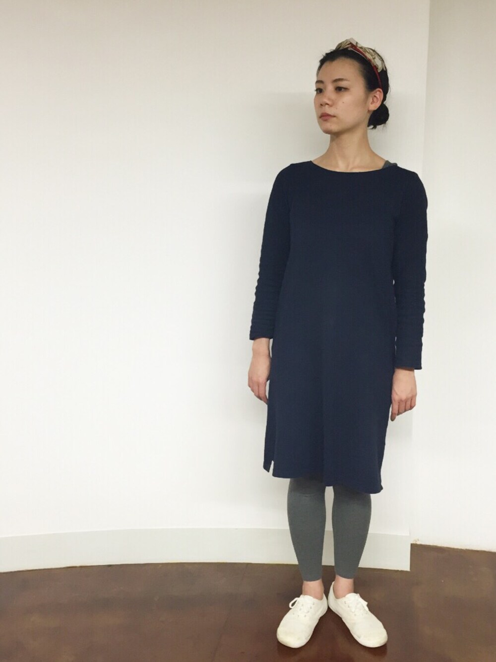 全身無印良品コーディネート。 無印良品の綿のワンピースは生地がしっかりしていてお気に入り。 そして、ポイントのターバンはビンテージのリメイクものを扱っている『Leah-K』で購入したビンテージスカーフのリメイクもの☺︎♡