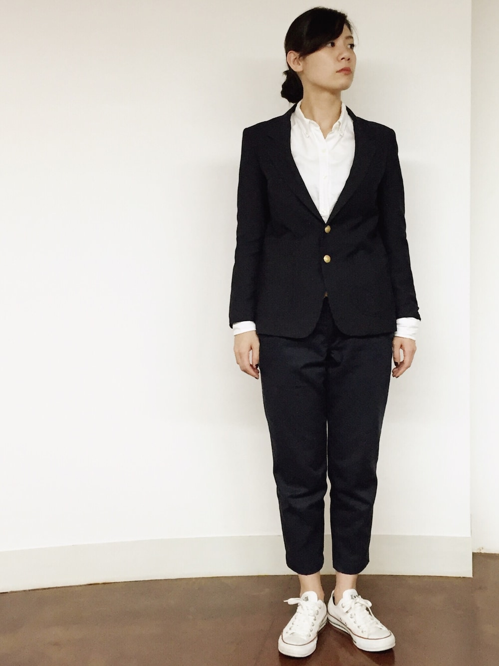 セットアップ風のコーディネート。 ブレザーは古着で、アメリカの小学生の制服らしいです。 金ボタンがお気に入り☺︎♡