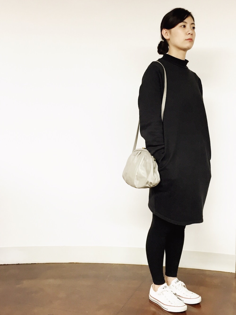 ブラックコーディネート。 スエット生地のワンピースは、生地感も、タートルネックも、シルエットも大好きな一着。 ポケットがあるのもポイント。 真っ黒だから、バックは淡いカラー。 色がお気に入りです☺︎♡