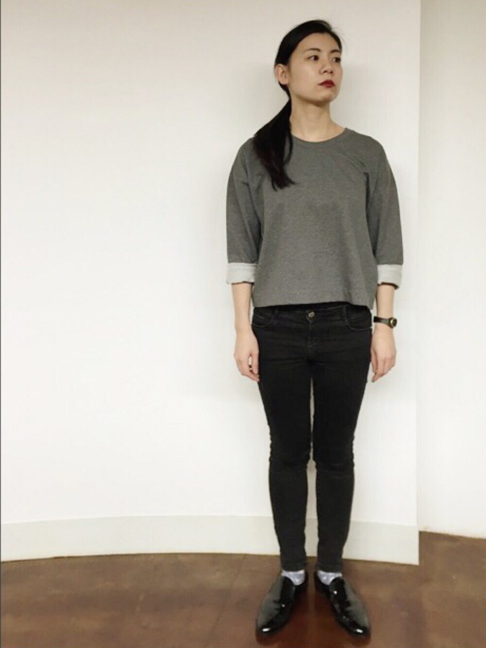 モノトーンコーディネート。 シンプルに。 シンプルだから、シルエットにちょっと変化をつけて、前が短くて幅広のスエット素材のトップスをチョイス💡