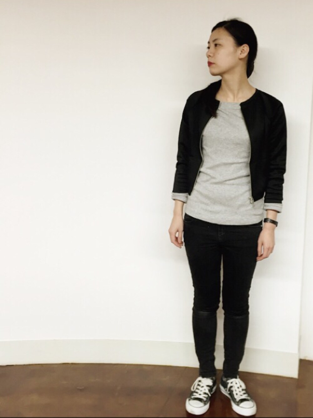 シンプルコーディネート。 暖かくなったら使いたいなと思って買った、 丈が短いジャージがポイントです☺︎ ワンピースなど、色々なものと合わせてみたいなと思ってます💡