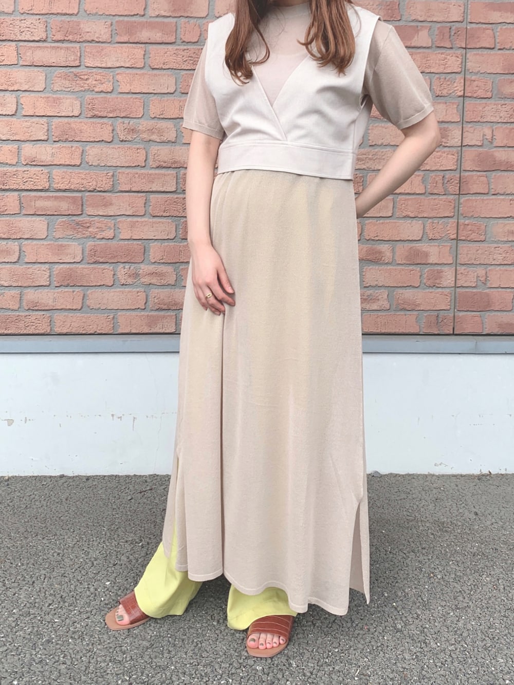 ビスチェとニットワンピースがセットのアイテム。 イエローパンツと合わせて夏らしくコーデ組みました🍋 ○ビスチェセットシアーニットワンピース 【着用カラー/サイズ】 BEG/FREE 【サイズ感】 ゆったりしたサイズ感です! 【素材感・着心地】 透け感のある素材なので夏でも涼しく着ていただけます◎