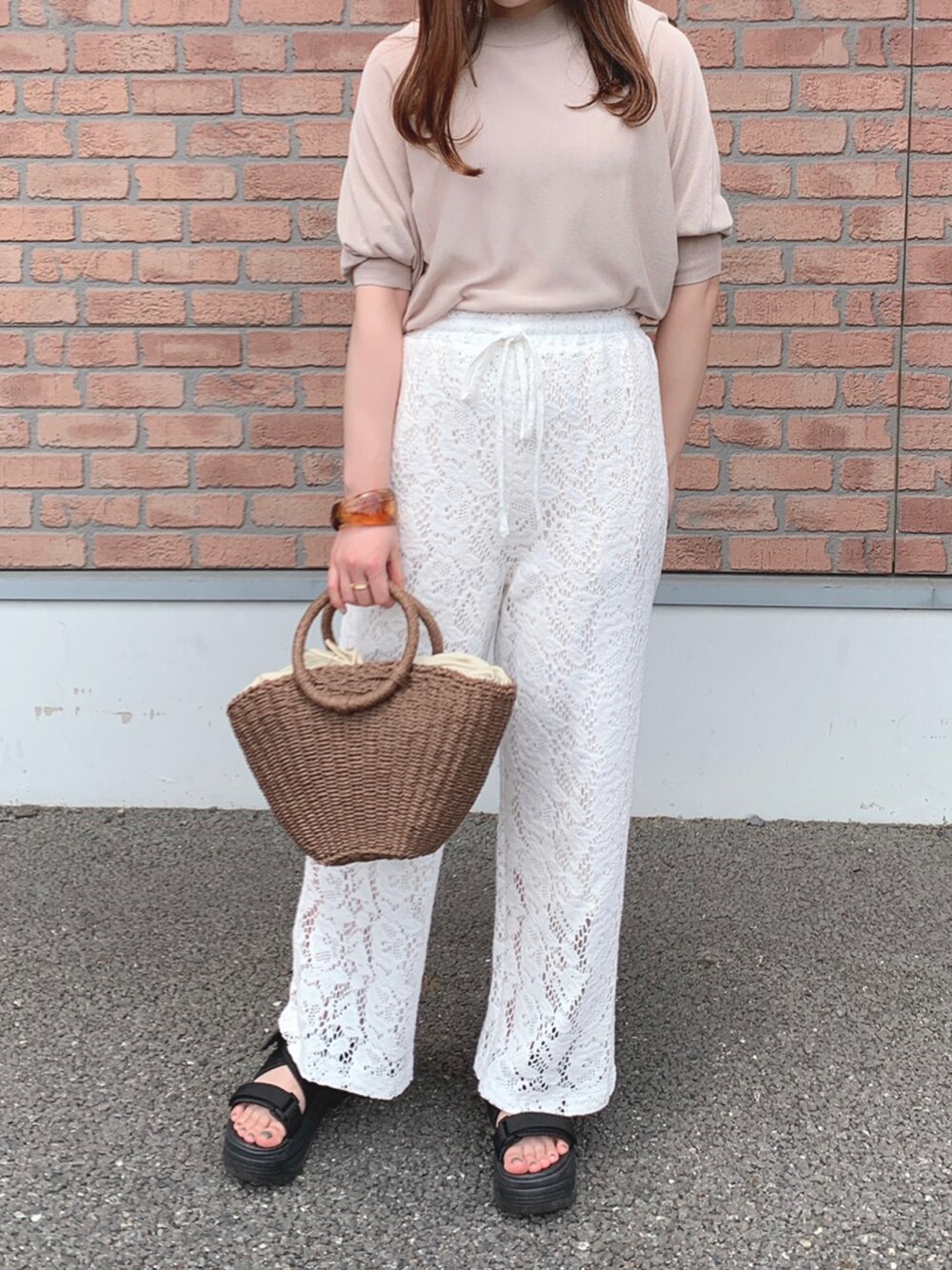 柄編みデザインのパンツにシアーニットを合わせて女性らしいコーデ組みました○ カゴバッグを持つと一気に夏らしさでますね🤍 ○柄編みレースパンツ 【着用カラー/サイズ】 OFF/FREE 【サイズ感】 ゆったりでウエストが紐で調節出来るので体型問わず着ていただけます!! 【素材感・着心地】 裏地がしっかりあるので透ける心配なく履いていただけます!柔らかい生地感なので着ていて着心地いいです◎