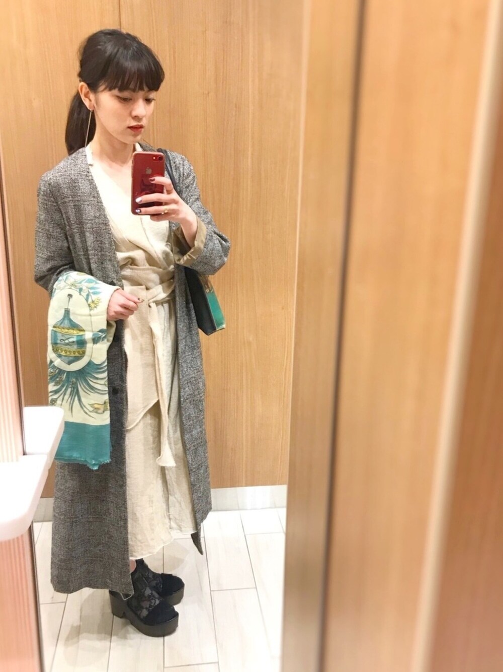 ここまでくると、 鏡撮り 三連続、、で。 こちらのアウター、そろそろ お休みなのでその前に、、 和服が好きなので、 和服みたいな洋服には 目がない。 今まで 2年間 note大宮店に居ましたが、 明日から丸ビル店に 異動になります♪ 丸ビルでも、私らしく。 休日すたいる。 2018 s/s