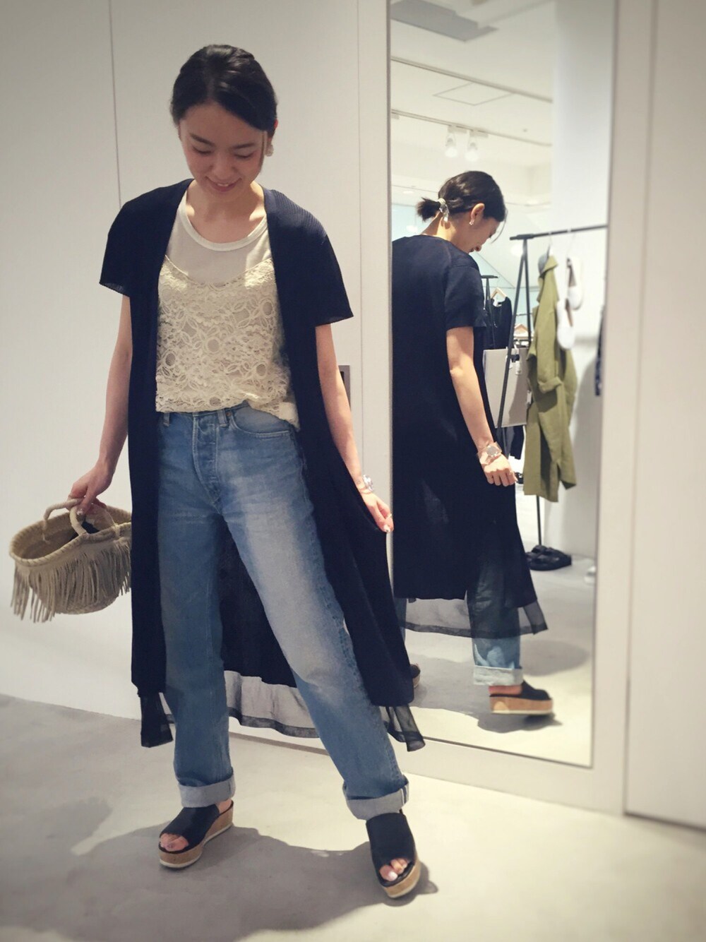 出勤すたいるのまま、撮影。 展示会で一目惚れした、 カーディガンが届きました! シースルーの部分が 熱帯魚みたいで可愛い、、♡ 2016 S/S