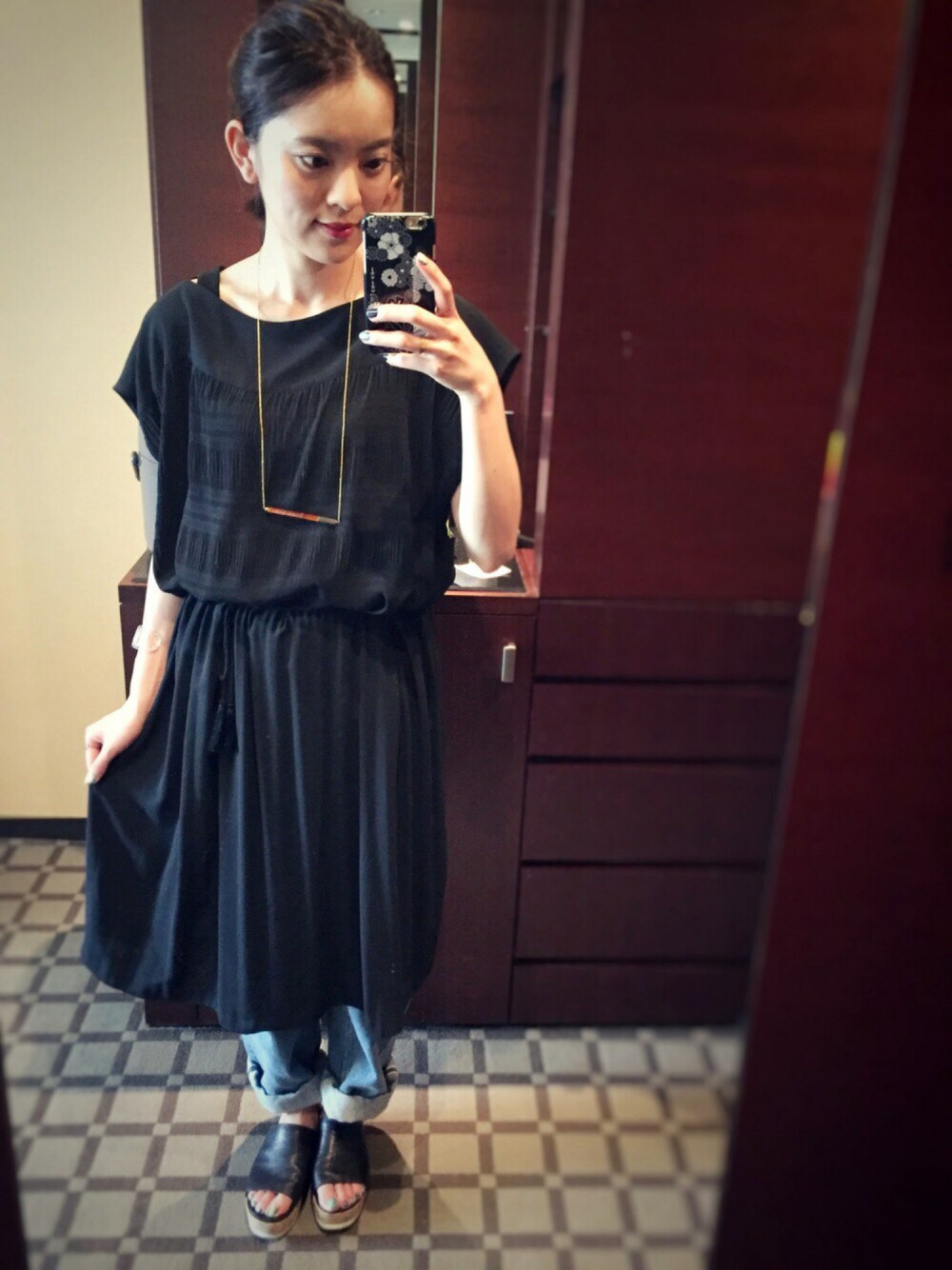 まなのワンピース「ドライジョーゼット マジョリカプリーツ加工 ポンチョOP」を使ったコーディネート