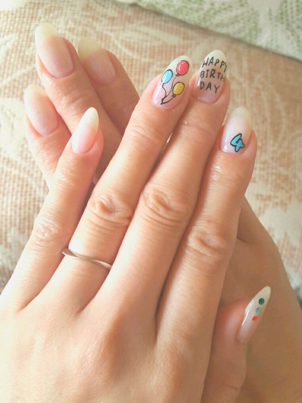 meryで可愛いネイルがあったのでマネて作ってもらいました。両手に描かずに、あえて片手のみで。書いてない方の爪は、ベースの白は同じで軽くラメを入れてもらいました。シンプルだけど可愛い。結構気に入ってます。