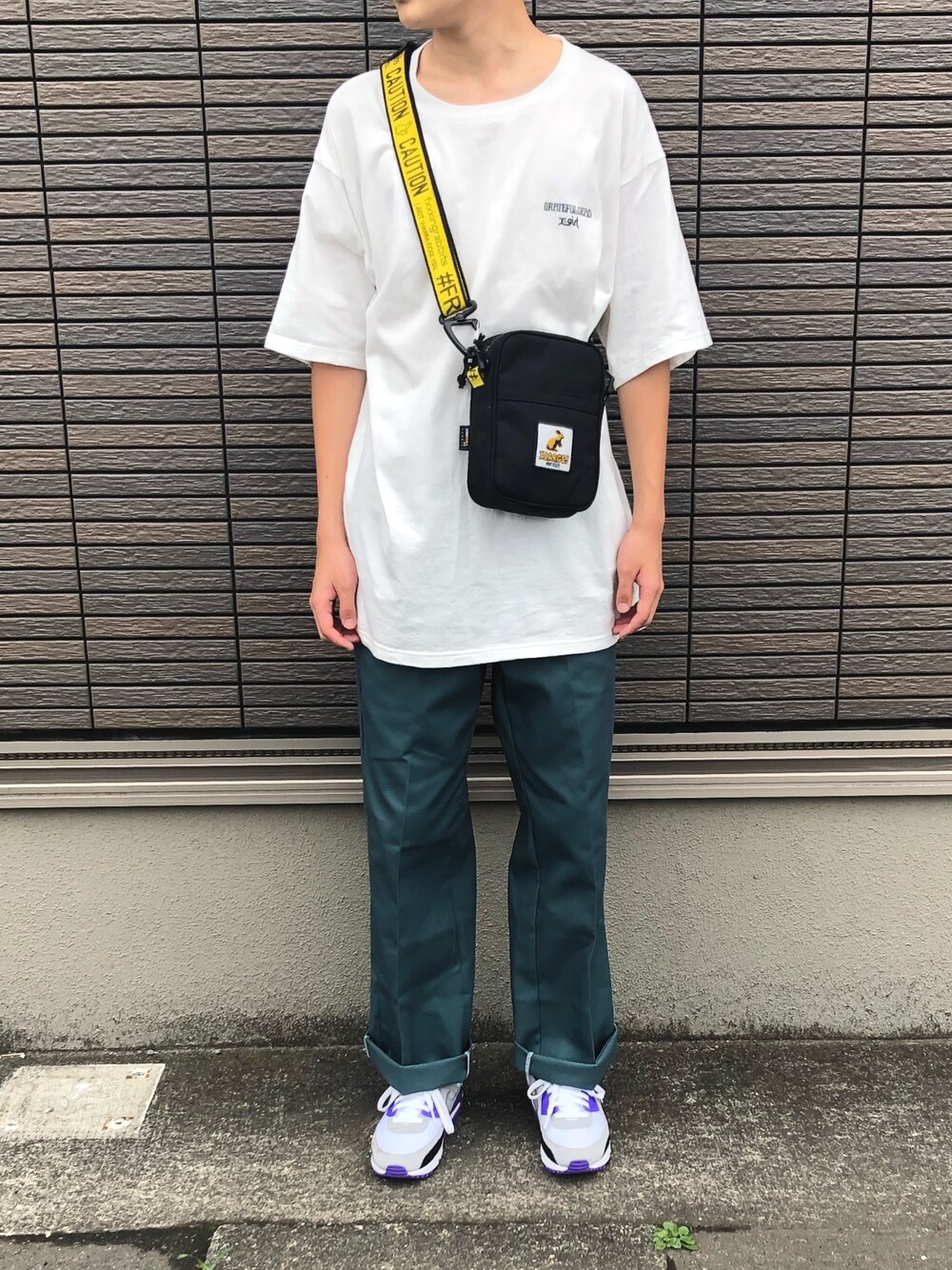 投稿見てくださりありがとうございます😍 GirlとbearのコラボTシャツに largeとfr2のショルダーバッグ購入して速攻着てパシャ📸 古着屋で見つけたいい色したパンツと90が最高に相性良い👌🏼 いいねとフォロー待ってます🤤