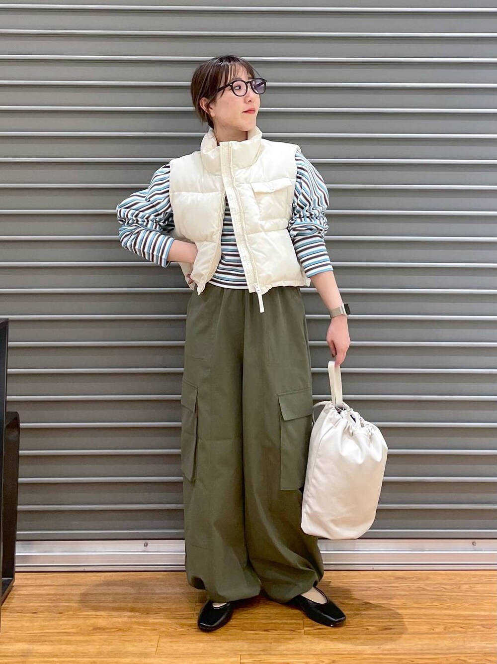 mana(LEPSIMステラタウン)のショルダーバッグ「フェイクレザーボンサックショルダー 105138」を使ったコーディネート