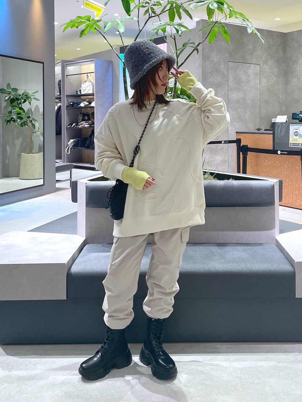 mana(LEPSIMステラタウン)のショルダーバッグ「オリジナル細コード巾着ショルダーバッグN」を使ったコーディネート