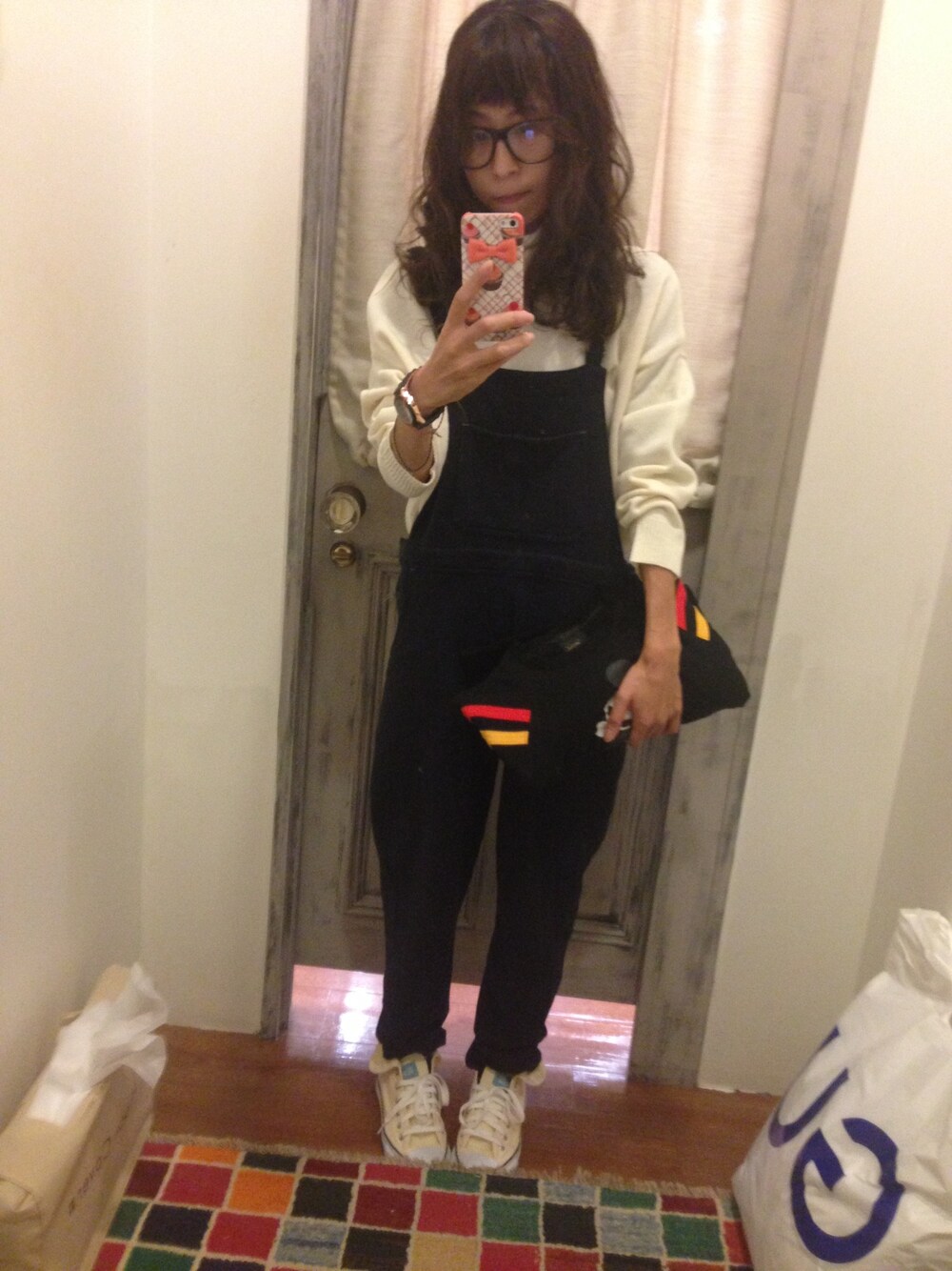 楽チンコーデ★ 去年買ったサロペはスウェット素材で めっちゃ楽〜꒰ෆ❛ั ु▿❛ั ु꒱ お尻のワッペンが、かわいい! guのニットは、安くて使えるっ!! メンズも含めて何種類か買っちゃった〜
