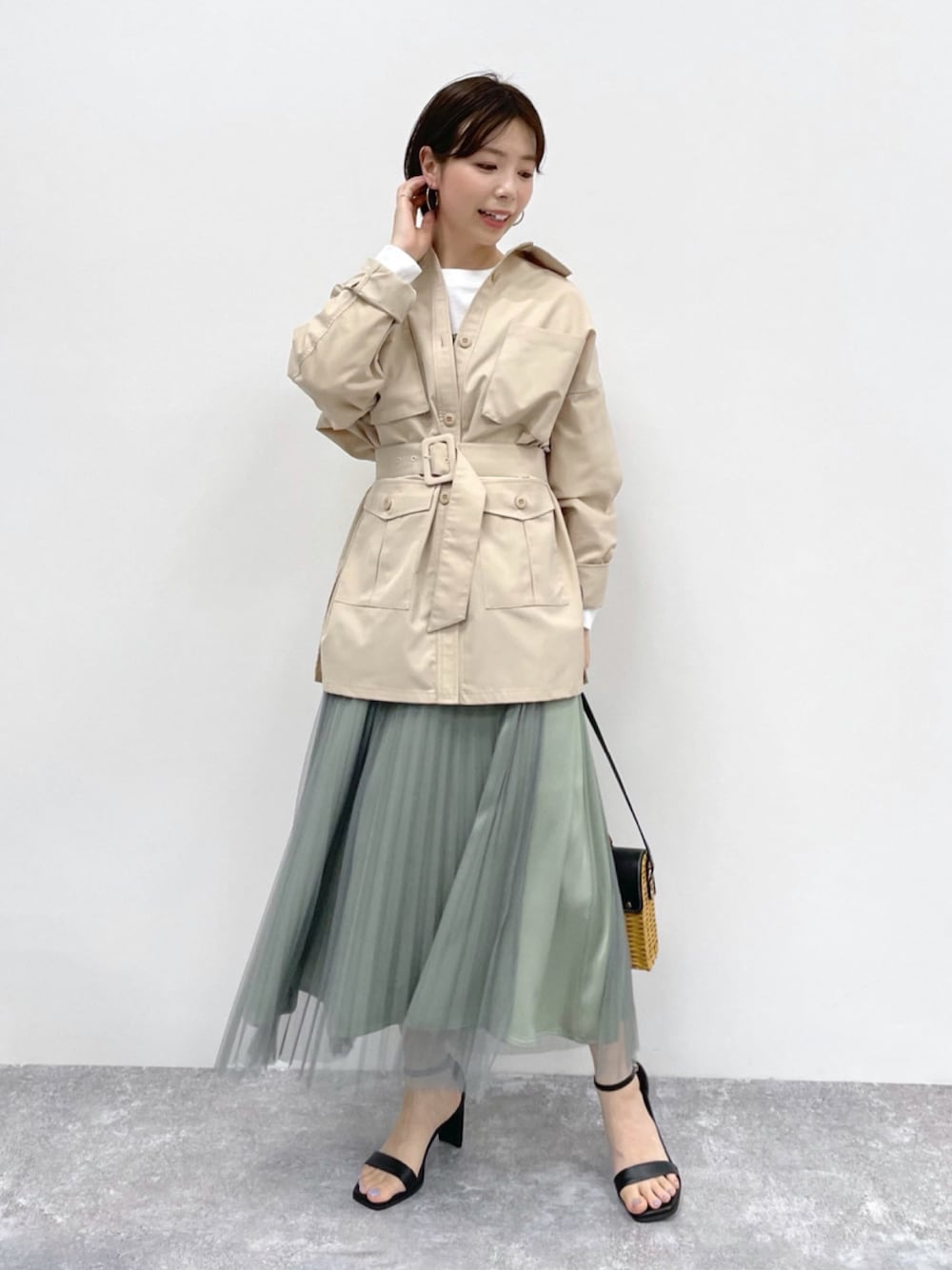 トップスとしても、羽織りとしてもお使いいただけるベルト付きのシャツコーデ。 少し綺麗めなスカートと合わせてオトナカジュアルスタイルに♡ トレンドのカジュアルアイテムも、どこかに女性らしさを入れるのがアンデミュウのオススメスタイリング。 スカートはF−サイズを着用しています☺︎