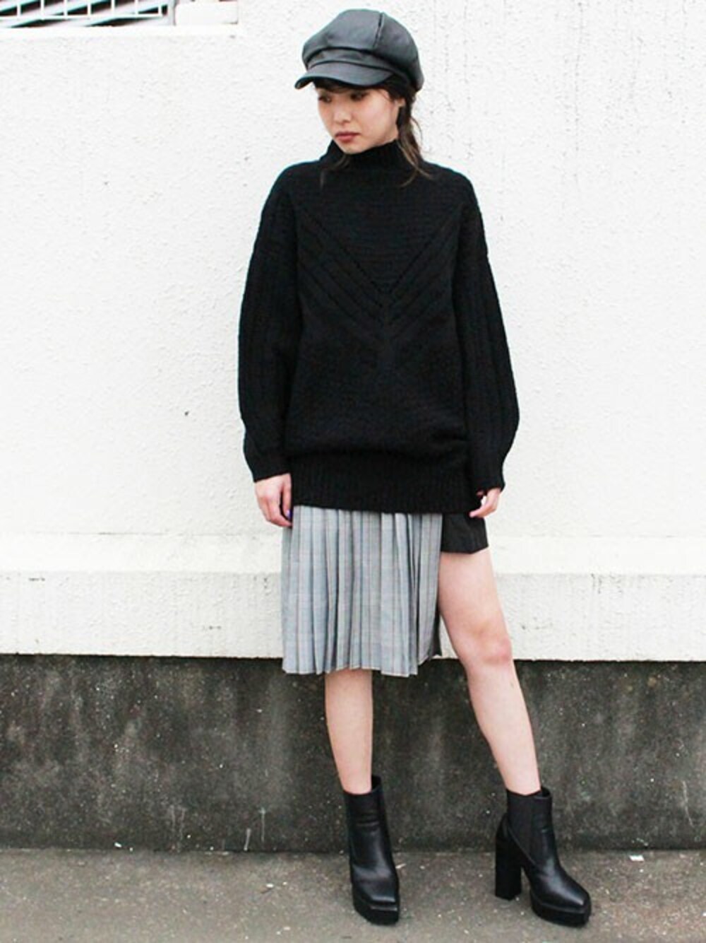 シンプルニットをトレンドのチェックプリーツスカートで大人ガーリーに。 モノトーンスタイルで引き締め効果あり。