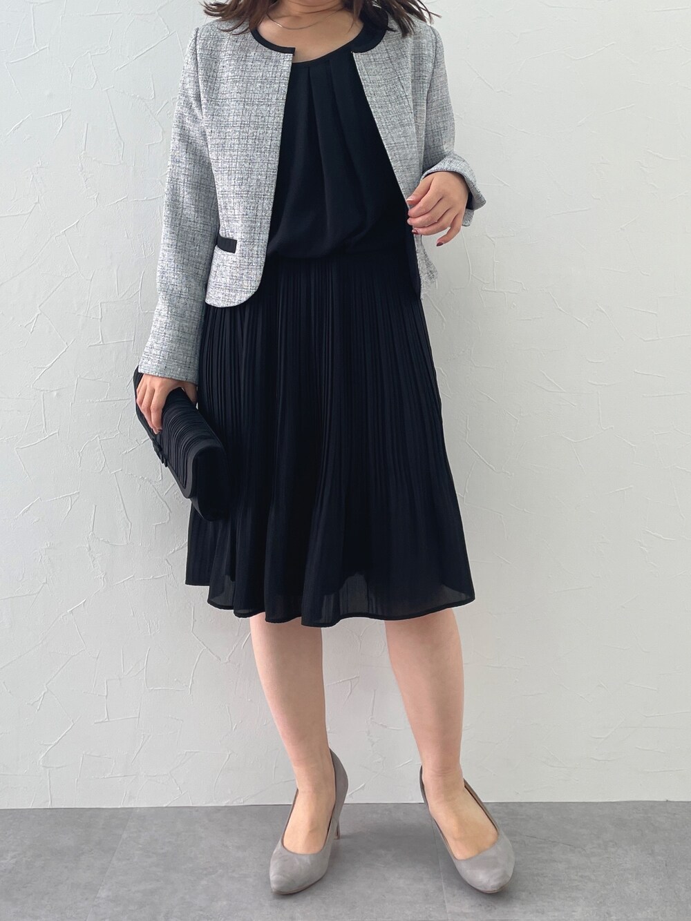 manami(nissen本店)のスーツセット「小さいサイズ 【入学式・卒業式・フォーマル】フォーマル3点セット(ノーカラージャケット+テーラードジャケット+半袖プリーツワンピース) 低身長さん・小柄女性」を使ったコーディネート