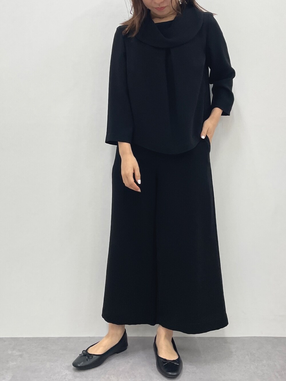 manami(nissen本店)のスーツセット「小さいサイズ 【喪服・礼服】日本製生地使用 洗える防しわ加工ロールネックブラウス+ワイドパンツセットアップ 低身長さん・小柄女性」を使ったコーディネート
