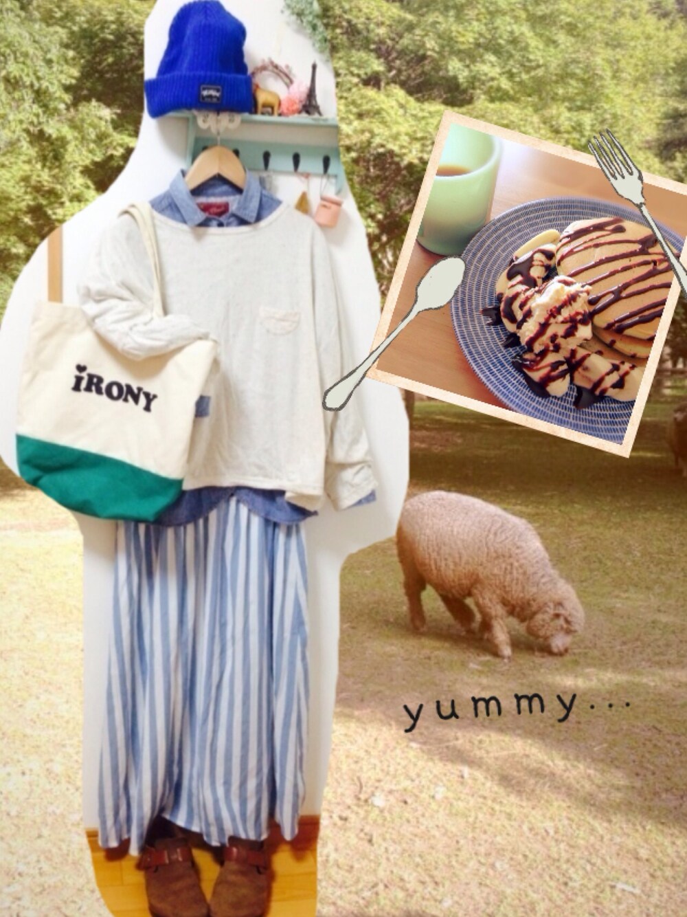 *tops// markey's *inner// Sunny clouds by felissimo *botms// nusy by felissimo *mag cup// fire king ヴィンテージ *dish// arabia 24h ブルーが好きなんだろか⁇ ブルー系の服が黒よりも多い気がする... 朝からパンケーキ♡ 旦那はベーコンチーズで 自分と息子はチョコバナナとアイス添え☺︎