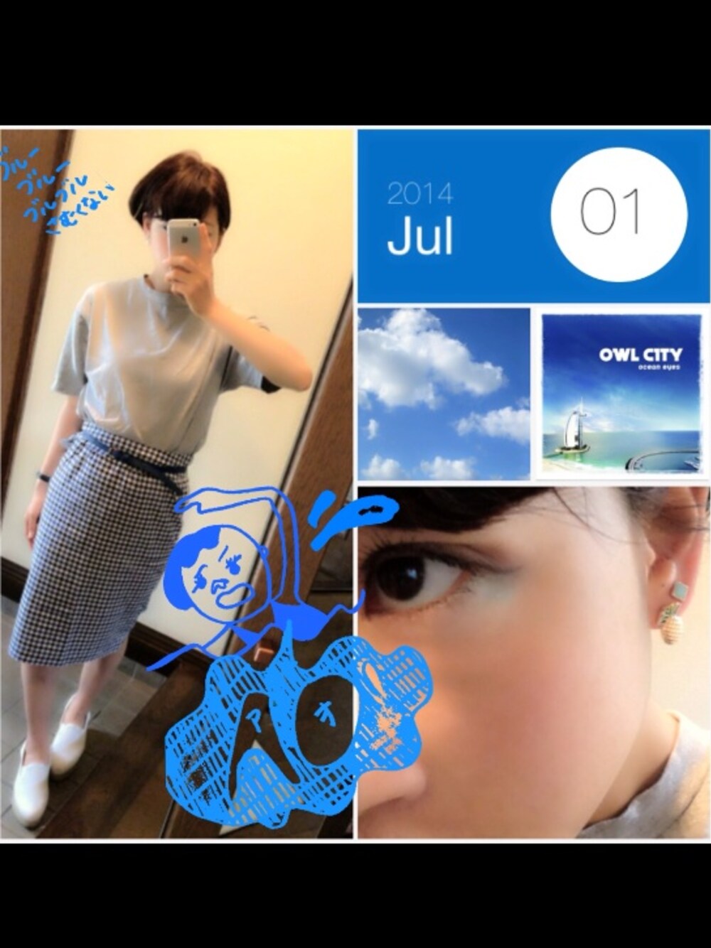 アッツイ!もうすぐ10:30な頃でした~ クロールしたい気分~ そんな気分はアオイロ気分~(笑) 目尻にブルーシャドウをいれて シカクピアスと揃ってブルーブルー💃レッツダンス! owl city /dental care~🚲🚲🚲 勿論ブルーな気分でも、ブルブル寒くもないですよ(^ω^)!笑