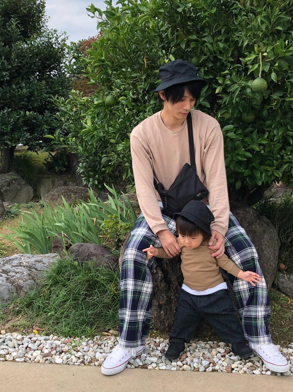 お父さんとお庭で 服は全身1万円以下でなるべく抑えたい💦 安くてもお洒落になれるように頑張りたいです😾