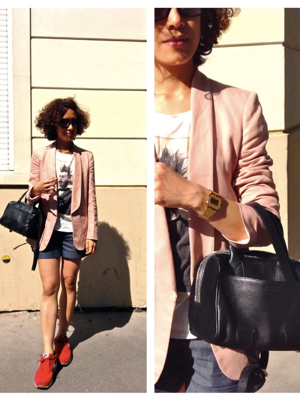 ジャケット(Jacket):Maje Tシャツ (T-shirt):Zara バッグ (bag):Claudie Pierlot ショートパンツ (shorts):Zara