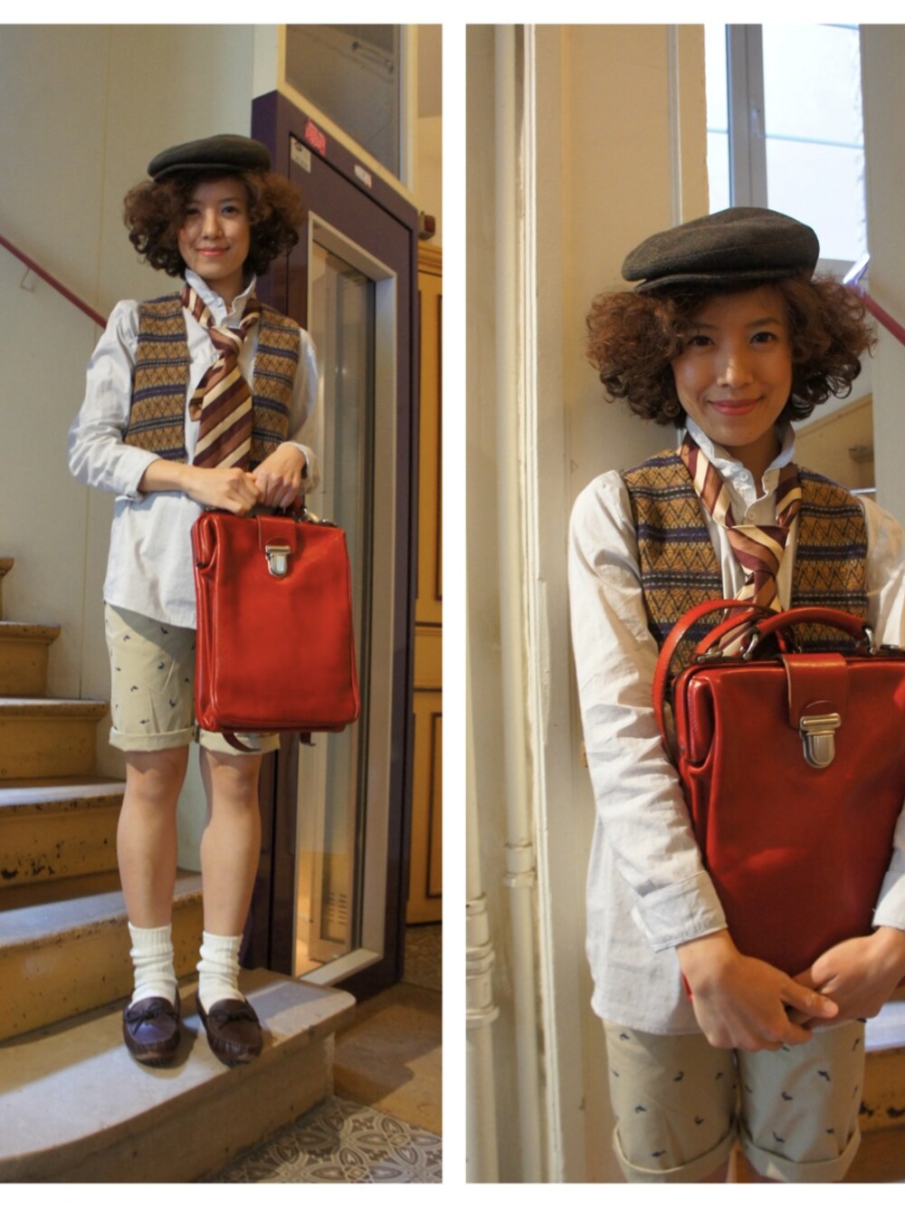 帽子:フランスのマーケット10€で買いました。 シャツ:monoprix, 14歳の子供用 (for boys) ネックタイ:古着 ベスト:日本の古着屋 ショートパンツ:monoprix, 14歳の子供用 (for boys) 靴下:Ralph Lauren 靴:Minnetonka 今日はメンンズのスタイルでお出かけしました。♪ ♪ 背が低いので、フランスの子供用服がけっこうフィットします。 ちょっと恥ずかしい。。。 今天走男童紳士風,因為身高實在不高,所以在法國也滿常去看童裝的,法國的童裝已經發展到很成熟的地步,某些品牌,不論是質料,樣式設計,配件都做得很好,有些款示也滿大人樣的,價格也比大人的衣服便宜一些,所以有時候在童裝店裡尋寶還滿有趣的!♪ ♪