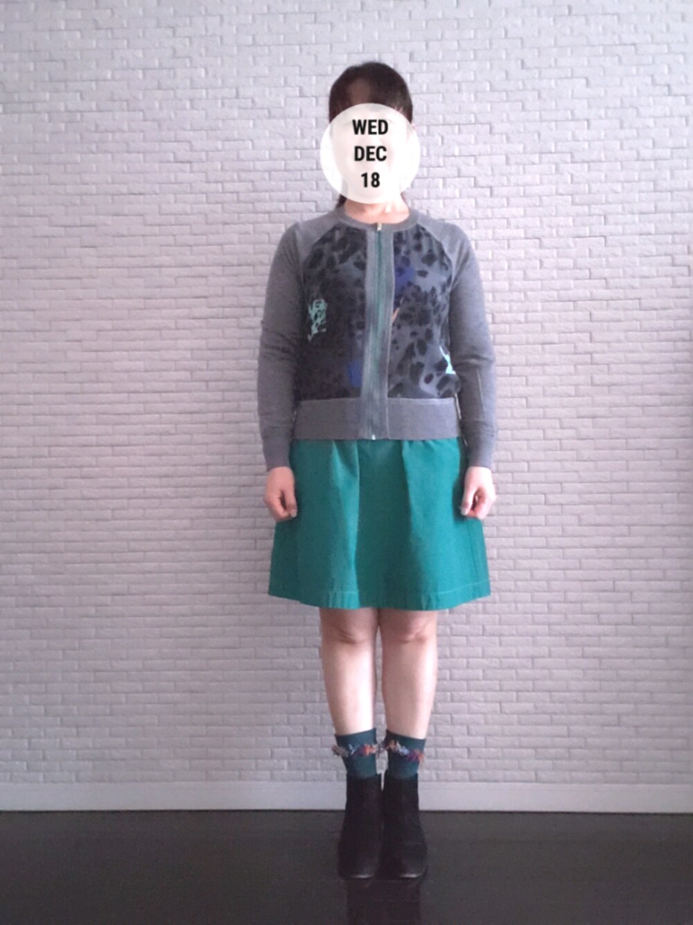ニットカーディガンはリバーシブルで使えます。 スカートは差し色のグリーンで! 靴下は折り曲げるつふさふさ出てくるんです笑