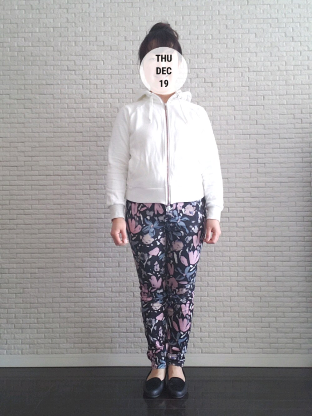 冬の白 柄のパンツに合わせるコーディネートが今年変わったのは、このパーカーを買ったから。袖口とフードにベージュが入っているバイカラーのパーカーです。 見えにくいけど、ファスナーがこのブランドの特徴です!