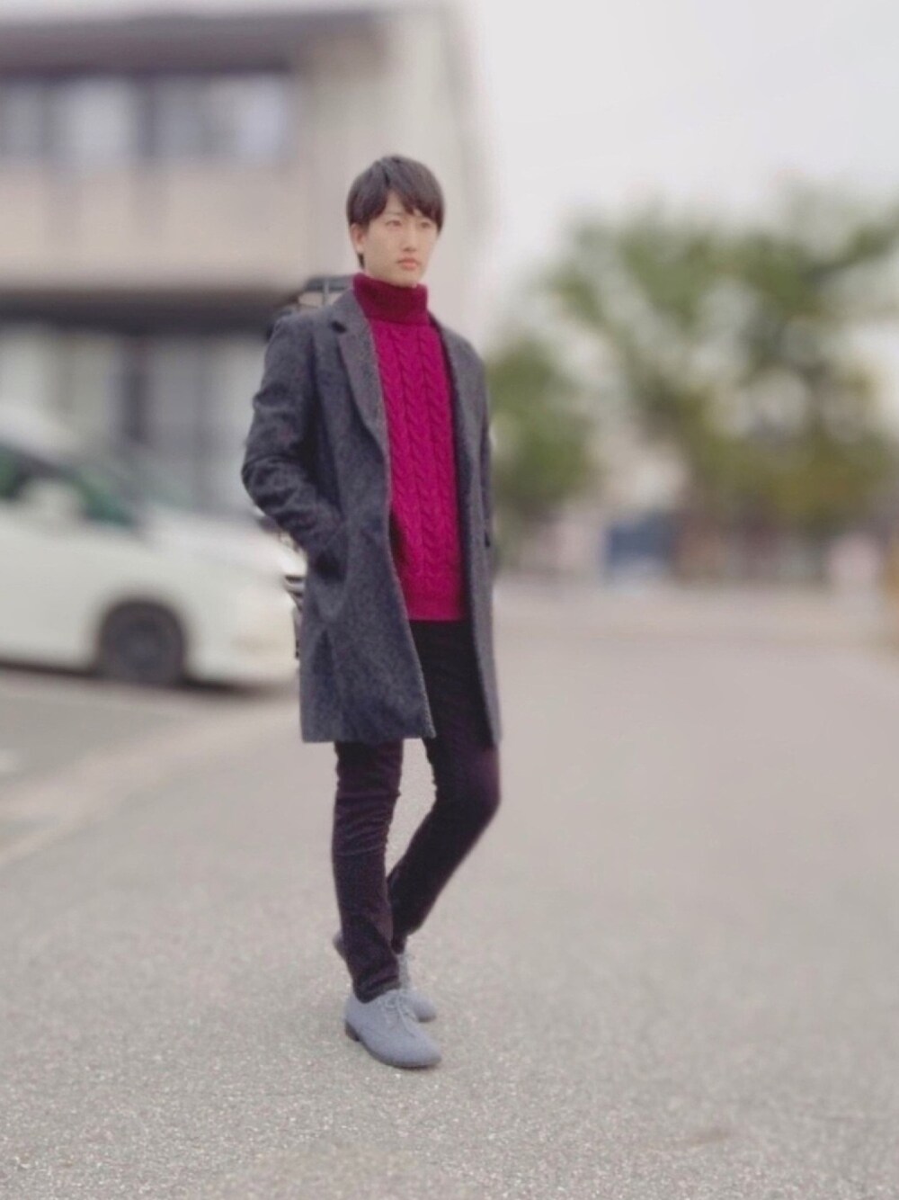 寒い日のラフなスタイルです! 【暖かい、動きやすい、ラク】の三拍子揃ってます👏 モノトーンにワインレッド入れると、大分雰囲気明るくなります♪ コートの柄も周りと被らないので、気に入ってます✊
