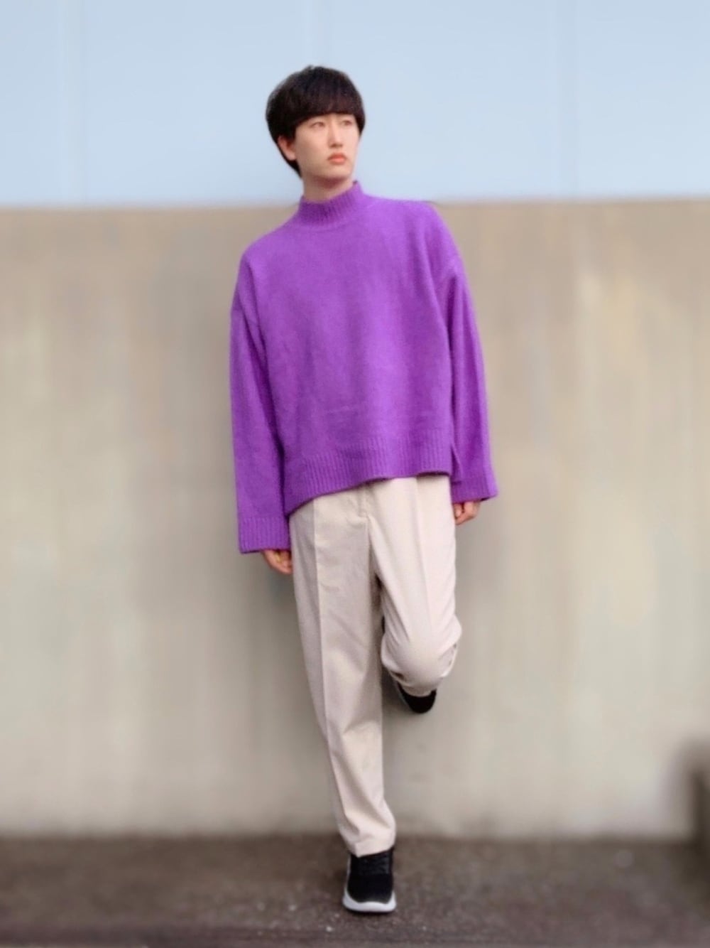 今回はキレイめシンプルコーデです! 着用の紫ニットは、以前黒のスリムパンツと合わせましたが、今回は白のワイドパンツと合わせました! 紫×白の相性抜群◎ 加えて、上も下も程よくワイドで清潔感ありありです👏 最近買ったユニクロの靴も可愛くておすすめです!