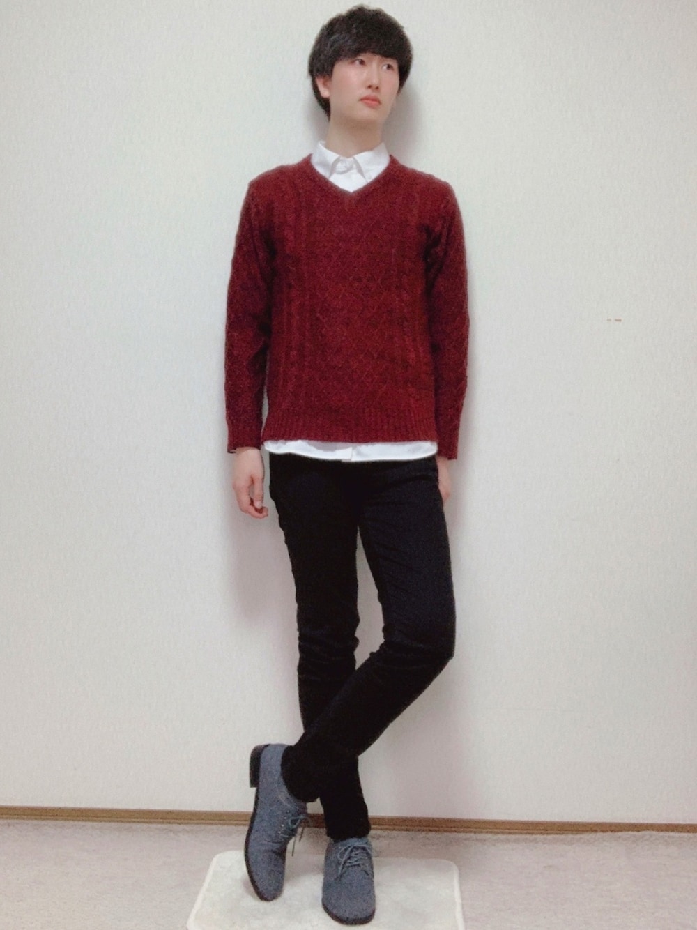 シンプルコーデです! vネックニットは、シャツ×ニット スタイルにもってこいですね◎