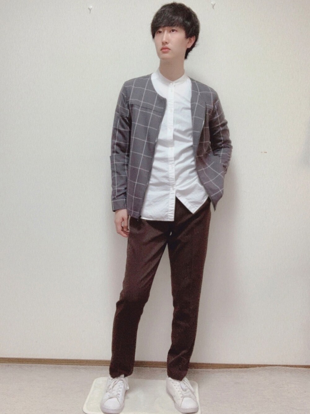 ノーカラーシャツ×ノーカラージャケットの春コーデスタイルです! 着用のグレーのノーカラージャケットは可愛くてオススメです👌